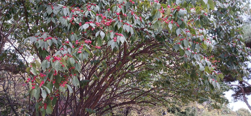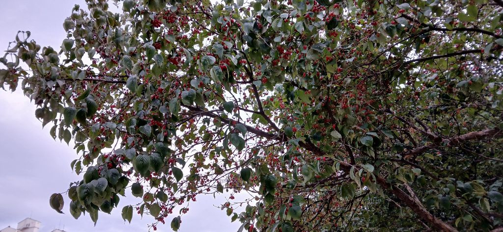 산수유. 팥배나무 빨갛게 익은 열매 위로