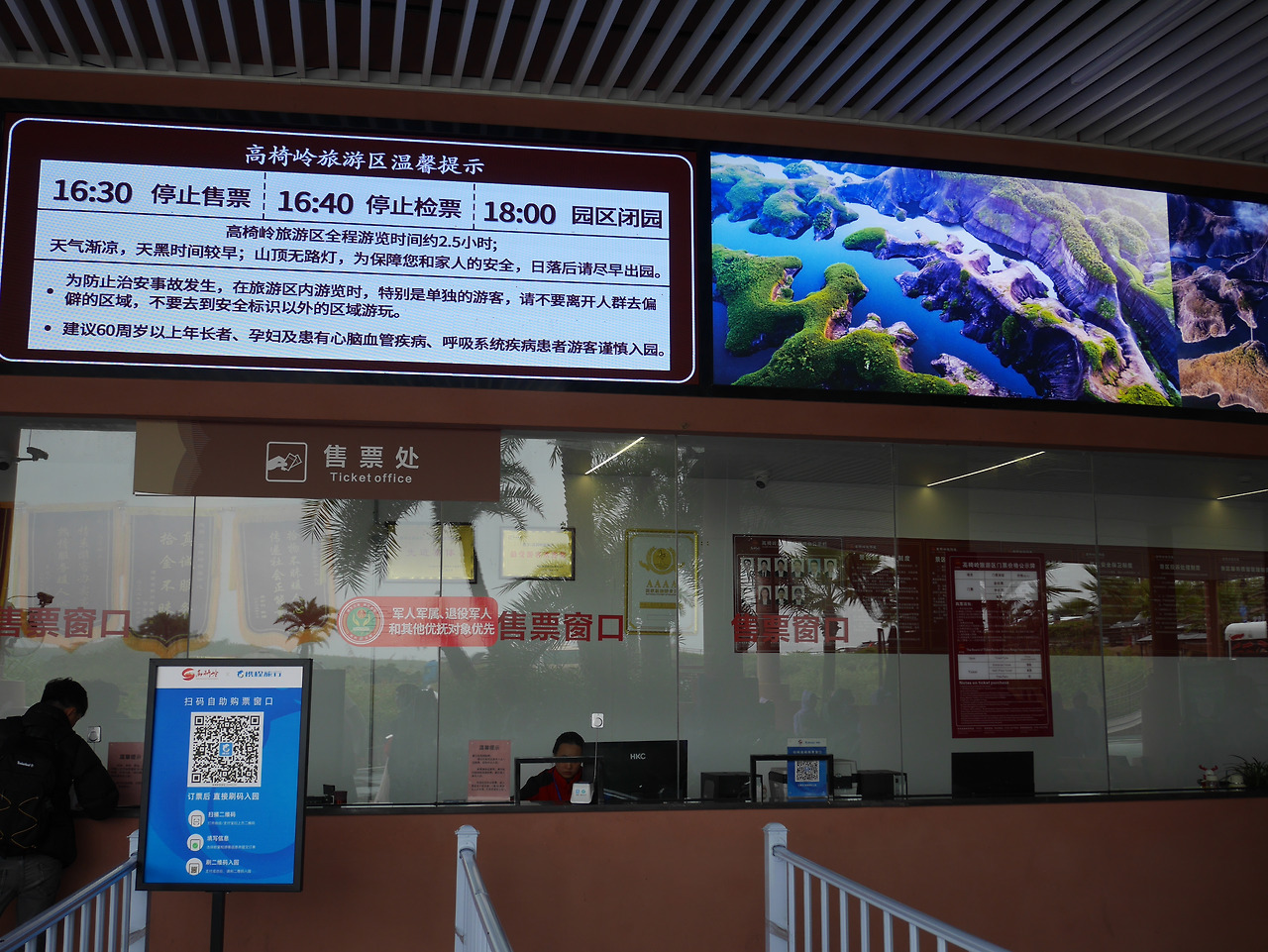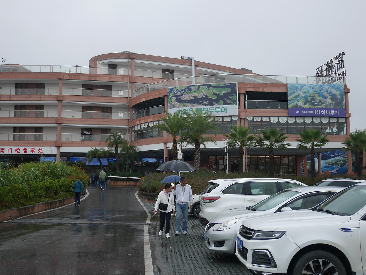 고의령 매표소 건물의 입구에 걸린 한국 여행사의 광고판.