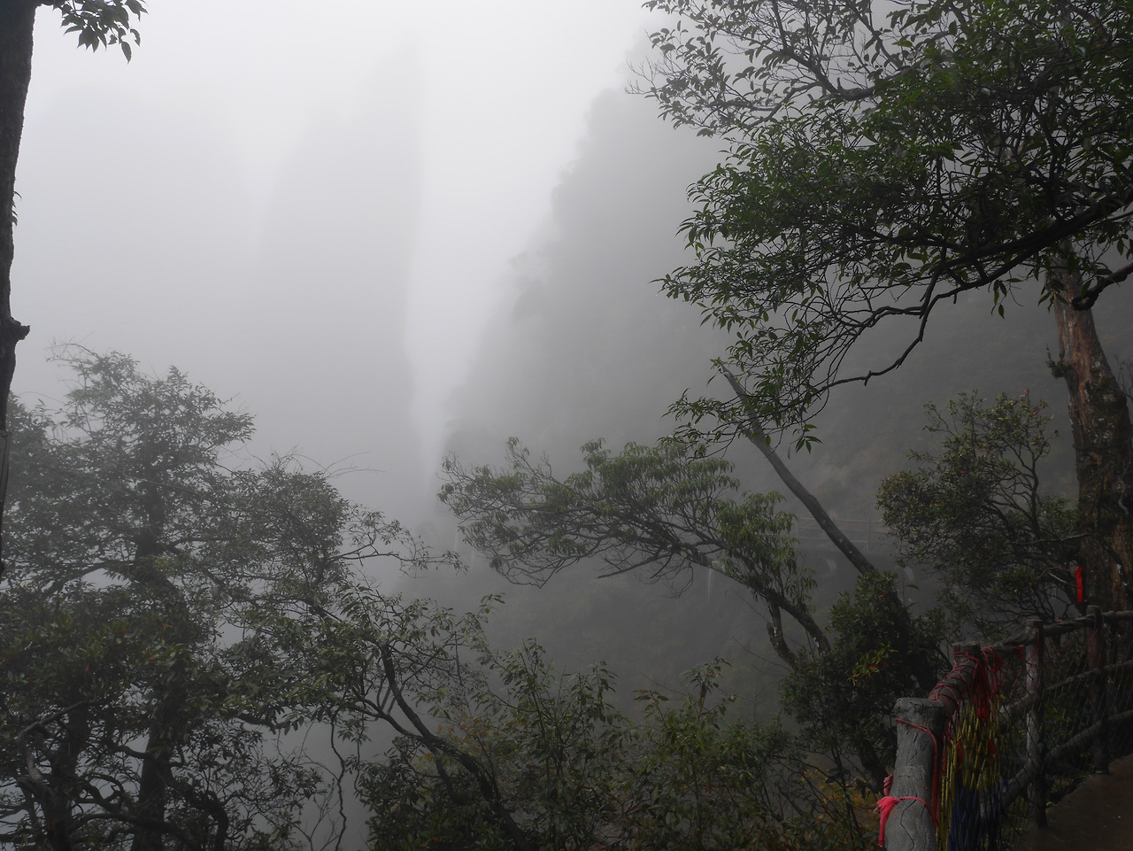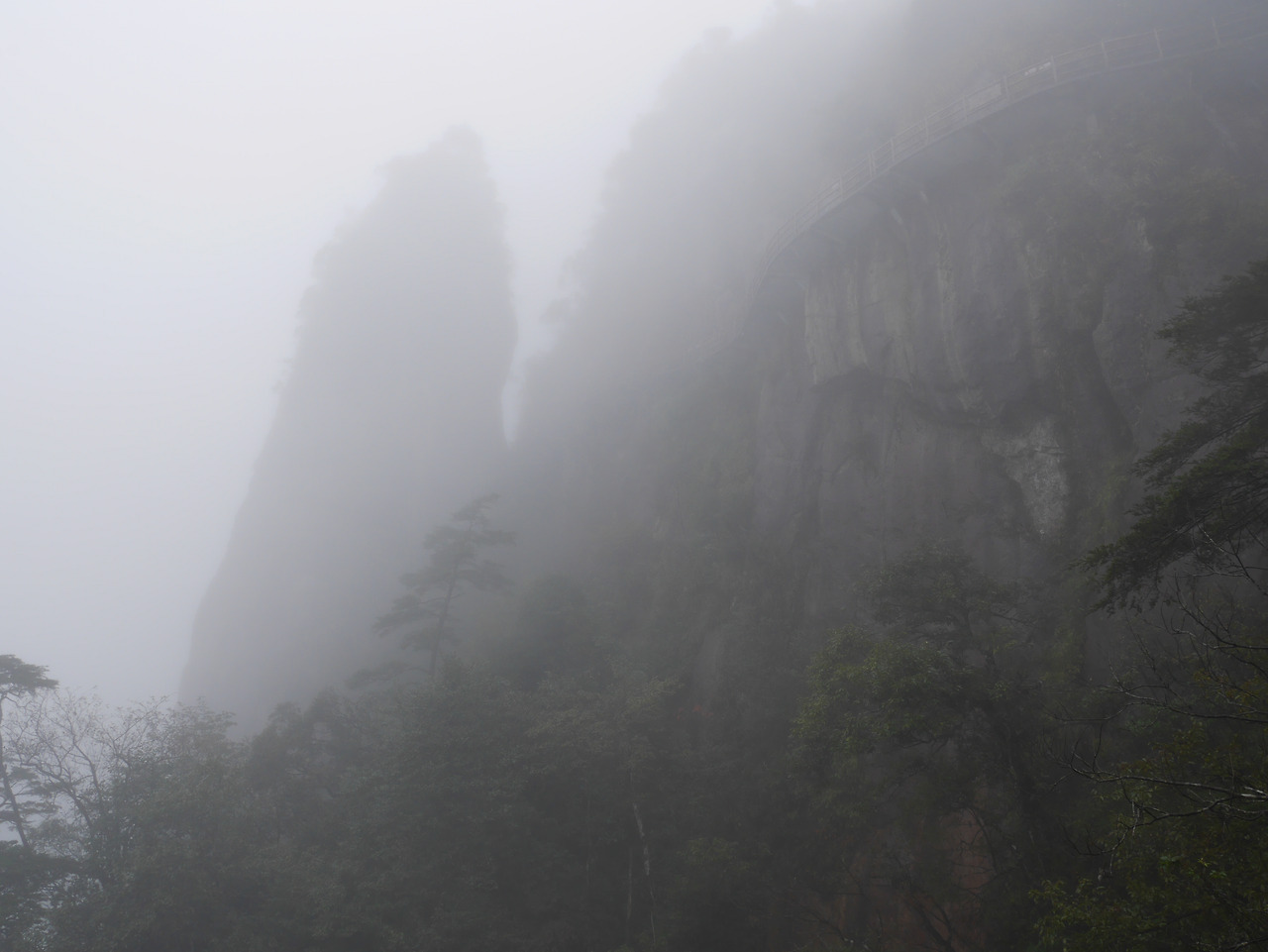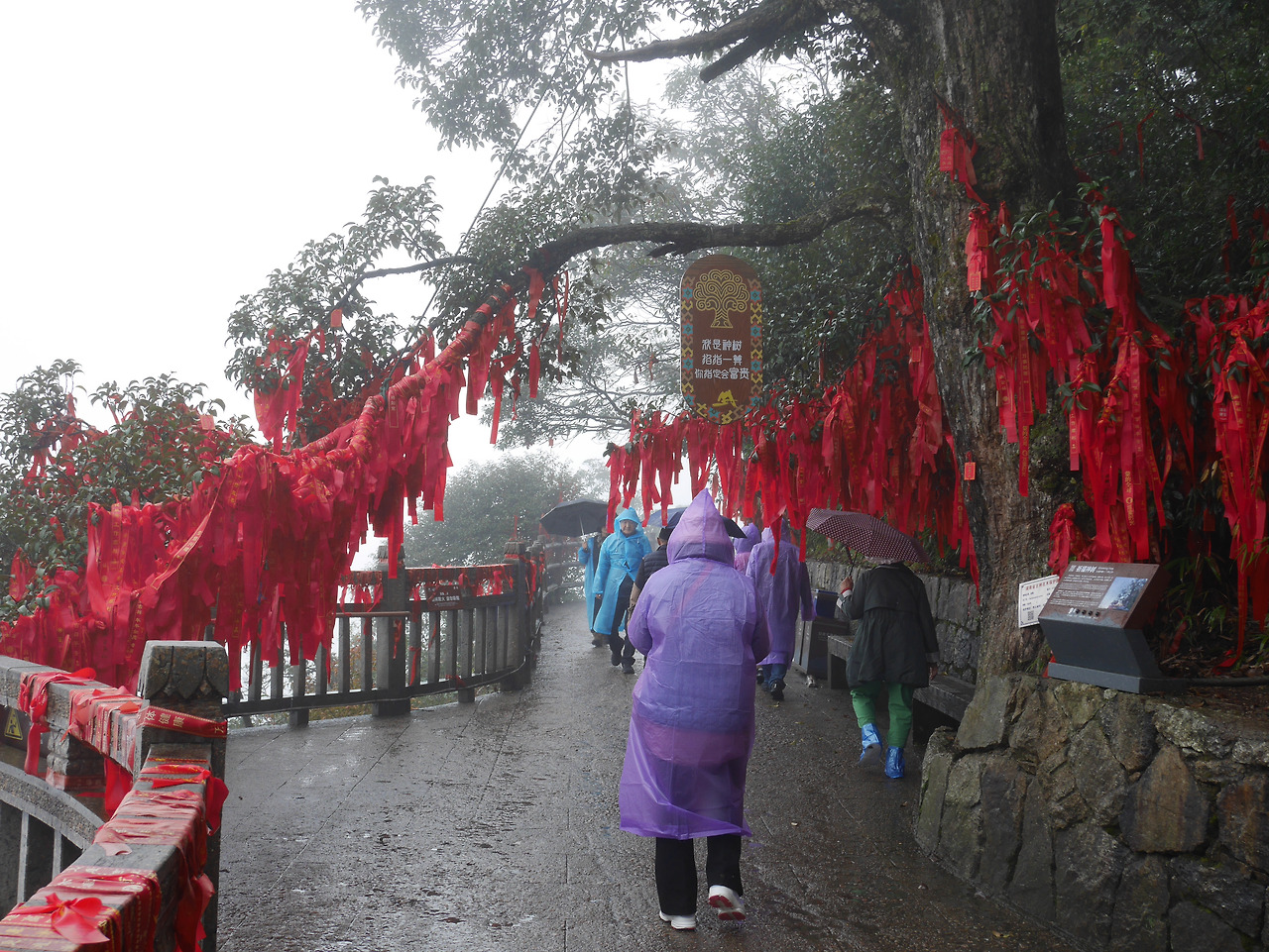 셔틀버스로 들어가 케이블카를 타고 해발 1600m 망산 오지봉으로 올랐다. 8인승 케이블카에서 발아래 펼쳐지는 자연경관을 감상할 수 있다고 하였으나 간간히 등산로와 작은 폭포가 보였지만 비와 안개로 전혀 내려다 볼 수 없었다. 망산은 중국 최초 무장애관광지로 여러 산악단체의 상을 받았다고 자랑하였다. 한글 설명판에 의하면 망산. 오지봉 관광지구는 전처우시 이장현에 위치한 관광지구로 지붕비도. 운잔만보. 금편람성. 동문영상. 마천망월.천대탐험. 관음예불. 만수기복 등 주변의 산봉우리와 나무에 갖가지 명칭을 붙혀 놓아 자연에 그럴듯한 이름을 붙이기 좋아하는 중국인 특유의 모습을 볼 수 있었다. 잔도가 잘 조성되어 노약자도 신비스러운 자연 경관을 감상하며 걸을 수 있다고 하여 우리 일행 모두 가이드를 따라 출발하였으나 안개에 가려 전망은 볼 수 없었다. 비는 계속 내리니 신발도 젖기 시작하여 입구에는 파는 1회용 장화를 하나 살껄.... 하산한 후 나도 20위안을 주고 한 컬레 샀는데 신을 기회는 없었다. 곳곳에 요족소녀가 두 팔을 벌려 팔방의 손님들을 반가히 맞이한다는 요대전망. 가지와 잎이 무성하고 끊임없이 자라며 이곳에서 복을 빈다는 기복신수. 회곡신수 거꾸로 꽂은 붓과 같다는 묘필생화, 팔괘대. 남창봉기의 인물 주덕의 소도 등 곳곳에 전설과 역사가 담긴 곳들이 안개 속의 흐릿한 실루엣만 보이니 안타까웠다. 망산의 하이라이트는 사람의 5손가락을 펼친 V자 모양의 오지봉이라고 하였다. 우리는 이곳까지만 보고 하산하기로 하여 잠시 안개가 걷히기를 기다렸으나 전혀 그 모습을 볼 수 없어 아쉬움을 뒤로 하고 산위에 설치된 에스켈리이터로 하산하고 맞은 편의 금개구리가 관음보살에게 절한다는 금섬배불을 뒤로 하고 케이블카를 탔다. 신비한 자연 경관을 기대하며 망산을 올랐으나 자연이 허락하지 않았다. 산수화같은 경관은 볼 수 없었지만 안개 속을 마치 신선처럼 걸을 수 있었다. 선계에서 잠시 머문 것만으로 만족하고 숙소인 망산산림온천으로 향하였다. 온천은 다양한 시설을 갖춘 대규모 시설이었지만 피곤하여 일찍 잠자리에 들었다. |