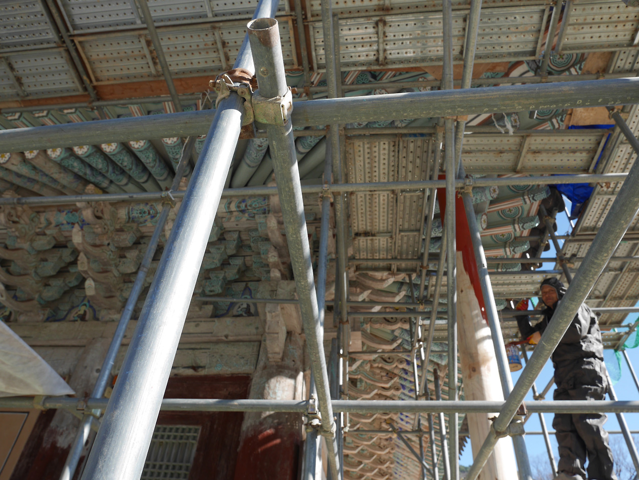 처마 아래의 단청은 그대로 두고 새로 세운 기둥만 붉은 칠을 한다고 하였다.