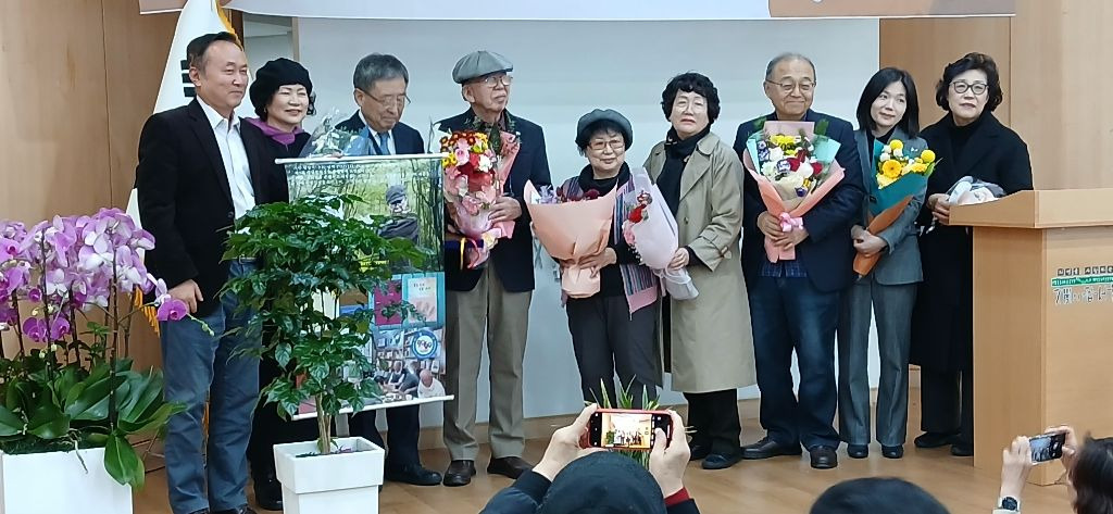 수상 축하 꽃다발 수여한 후 기념촬영.