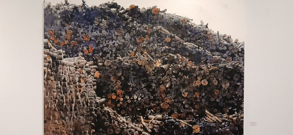 켜켜히 쌓인 크고 작은 원기둥의 나무 땔감들을 그린