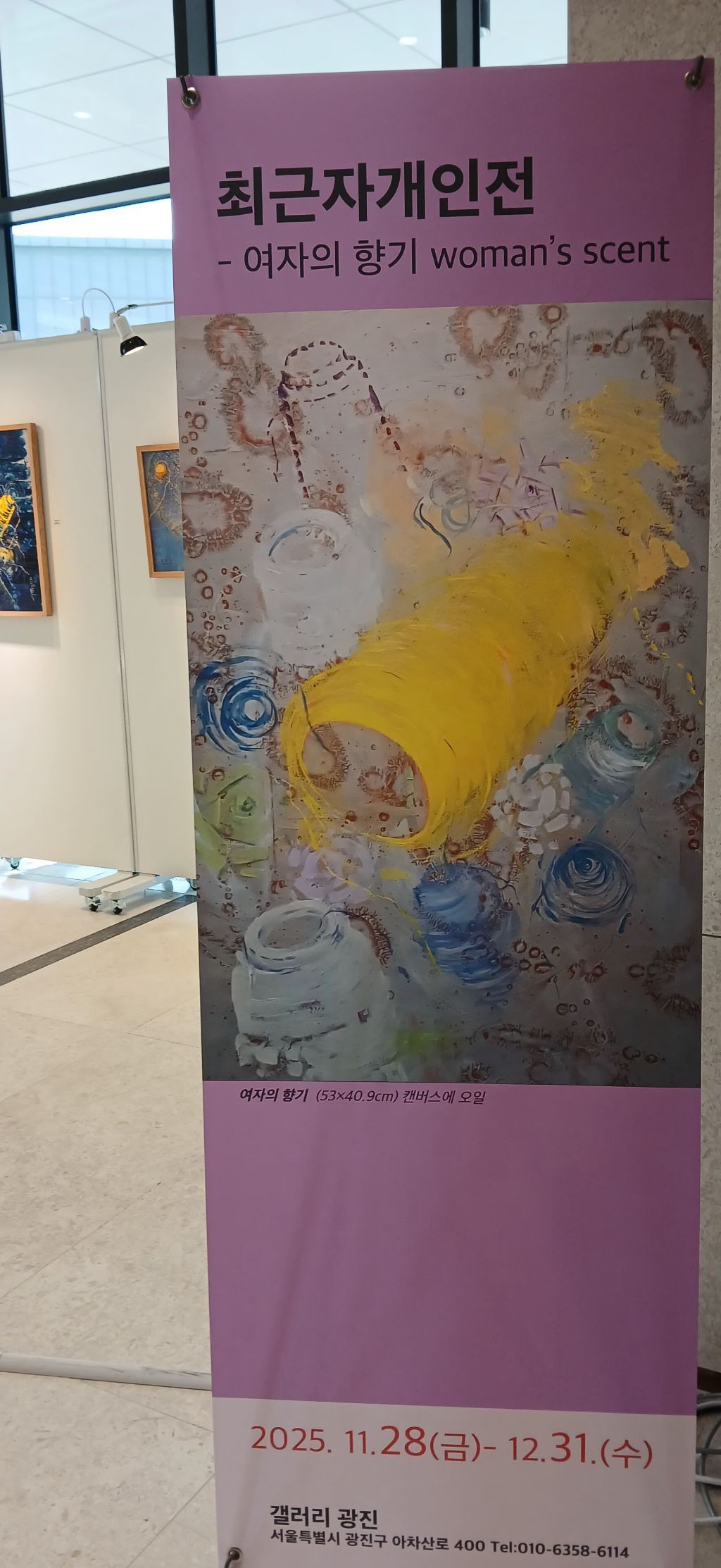 최근자-여자의 향기 2025. 11. 28~12. 31 갤러리 광진 광진미협 회원인 최근자님의 개인전이 광진갤러리에서 전시되고 있다는 소식을 들었지만, 차일피일 미루다 내일이 마지막 일정이라 부랴부랴 전시장으로 향하였다. 최근자 화가는 늘 <여자의 향기> 시리즈로 그림을 발표하였는데 이번에도 같은 주제의 그림들이었다. 실이 감긴 실꾸러미를 테마로 꾸준히 작업을 하여 왔는데 요즘은 직접 손뜨개질한 꽃이나, 털실 뭉치를 연상하게 하는 오브제도 함께 사용하여 작업하였다. 이번 작품에서도 최근자 특유의 파스텔톤의 부드러운 색채와 실이나 뜨개질에서 느낄 수있는 온화한 분위기의 그림들의 전시였다. 다음에는 또 어떤 여자의 향기를 맡게 될지 기대가 된다. |