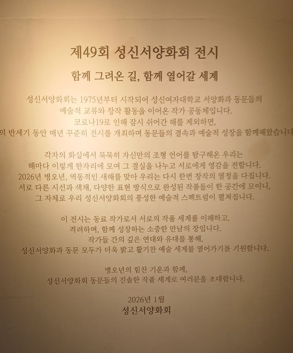 제 49회 성신서양화회 전시회 2026. 1. 3.~ 1.8. 아지트미술관 라메르 가는 길에 우연히 들렸던 성신서양화회, 지하에 있는 아지트미술관에 들어갔을때 전시장을 지키는 사람도 관람객도 아무도 없었다. 2026년 병오년을 맞이하여 역동적인 말의 기운이 감도는 시작점에서 동문들이 한자리에 모여 동문전을 개최한다는 안내문을 읽고 아마도 성신여대 동문회전인가 짐작. 낯익은 그림이 있어 가까기 가보니 우리 광진미협 김남열 회장님의 <나비의 꿈-행복9>작품이었다. 반가운 마음에 옅고 짙은 세잎크로버 그림과 동문들의 그림을 찬찬히 들여다 보았다. 전시장 한 귀퉁이에 싱크대, 주방기구등도 있어 이곳을 아지트처럼 이용할 수 있겠구나 생각하였다. |