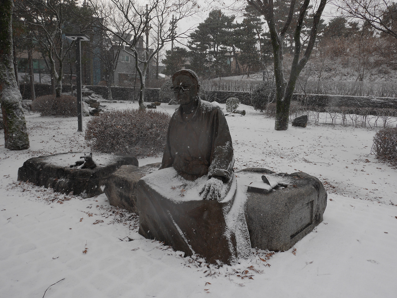치마에 흰눈을 가득 안고 앉아있는 박경리 동상.
